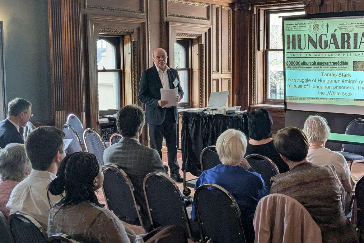Stark Tamás The Struggle of Hungarian Émigré Groups for the Release of Hungarian Prisoners című előadásában a nagy nemzetközi visszhangot kiváltó, 1950 szeptemberében, az ENSZ őszi ülésszakára készített „Fehér könyv” történetét mutatta be.