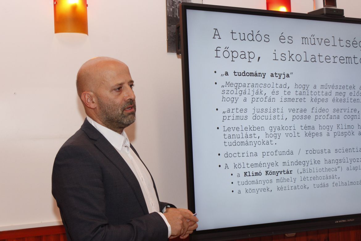 Gőzsy Zoltán A Klimo György pécsi püspökhöz 1777-ben írt versek egyháztörténeti vonatkozásai című előadásában hat költeményt elemzett, amelyek közül hármat a pécsi gimnázium oktatói, három gyászverset pedig Agyich István, Faicser Ferenc és Kőszeghy László írtak a püspökhöz. Pécsett a 18. század utolsó harmadára egy pezsgő, magas színvonalú, sajátos identitással rendelkező papi közeg formálódott. Az előadó azt mutatta be, hogy ezek a versek miként jelenítik meg a püspök által kialakított szemléletmódot, valamint megvizsgálta azt a szellemi és intézményi környezetet, amelyben a költemények születtek; egyben arra is rávilágított, hogy a költemények miként váltak a nevelési eszmény és a szellemi építkezés irodalmi lenyomatává.