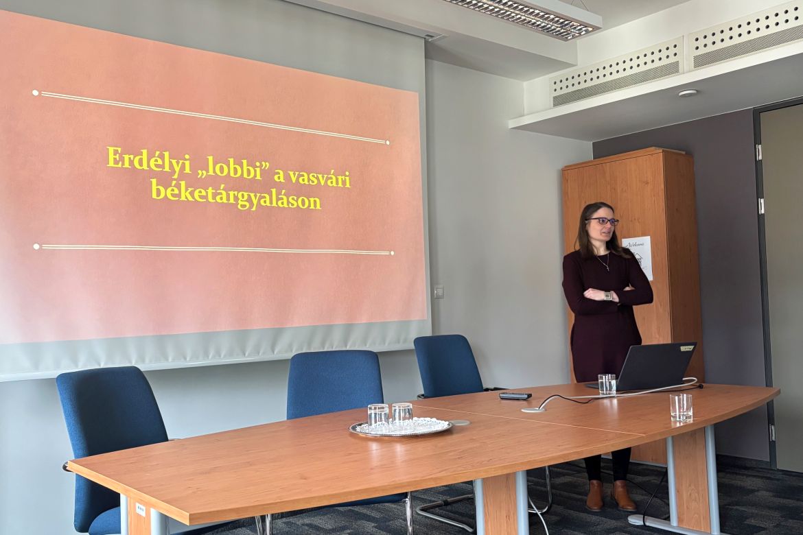 Szalai Ágnes előadásában azt járta körül, hogy az I. Apafi Mihály vezette fejedelmi kormányzat miként képviseltette magát és igyekezett érvényesíteni érdekeit az Oszmán Birodalom és a Habsburg Monarchia között az 1660-as évek elején, II. Rákóczi György sikertelen, lengyelek elleni hadjáratát követően, a térségben kitört háború lezárására irányuló, 1662-től megindult béketárgyalásokon. Ennek megfelelően ismertette a vasvári béke ratifikálásáig vezető erdélyi–oszmán és erdélyi–Habsburg diplomáciai tárgyalások menetét és eredményeit, továbbá a vasvári béke következményeit az Erdélyi Fejedelemségre nézve.