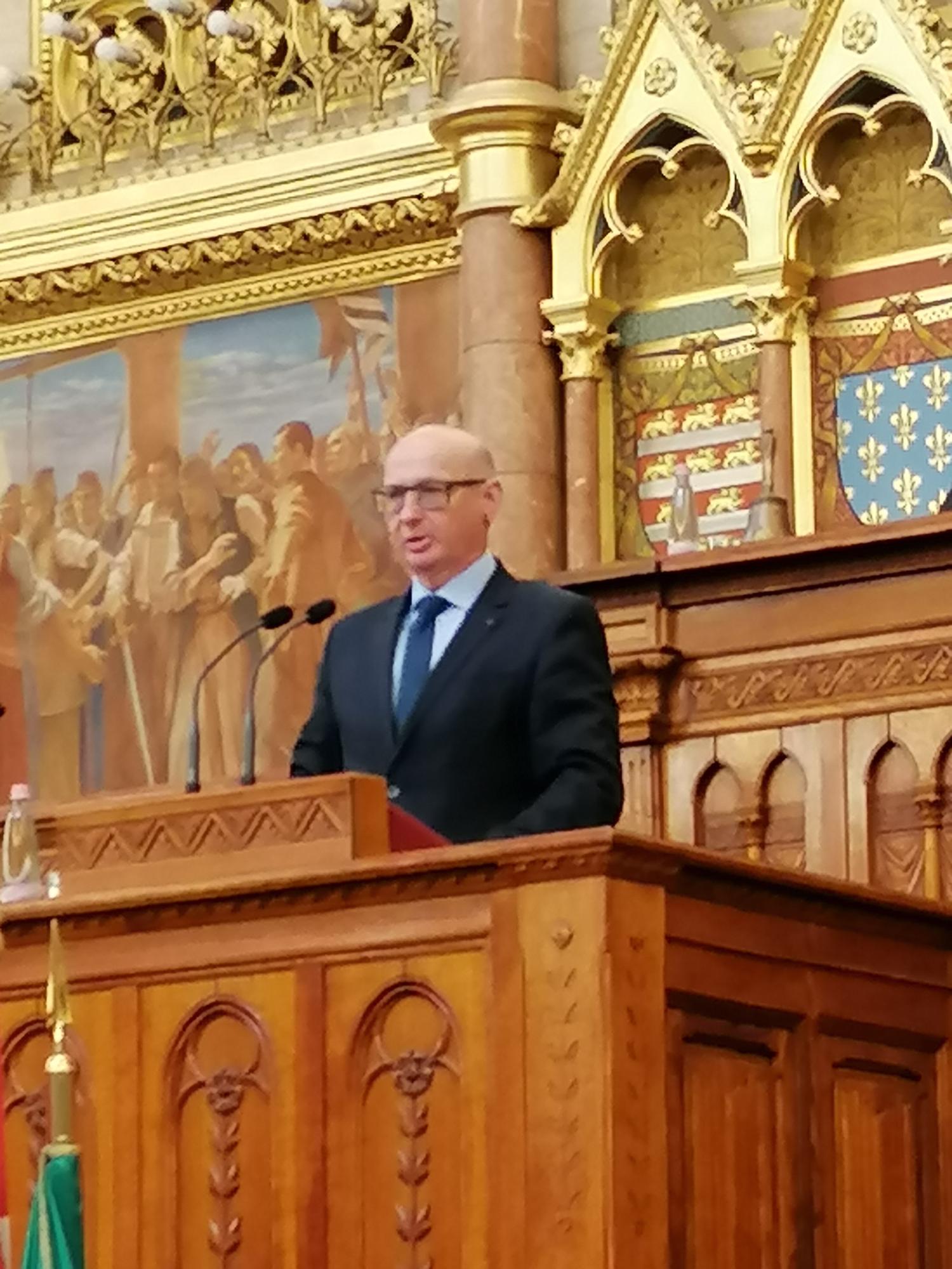 Az Országház főrendiházi üléstermében, nagy érdeklődés mellett lezajlott tudományos ülést Kövér László házelnök ünnepi beszéde és Mezey Barna jogtudós, az ELTE korábbi rektora bevezető előadása nyitotta meg.