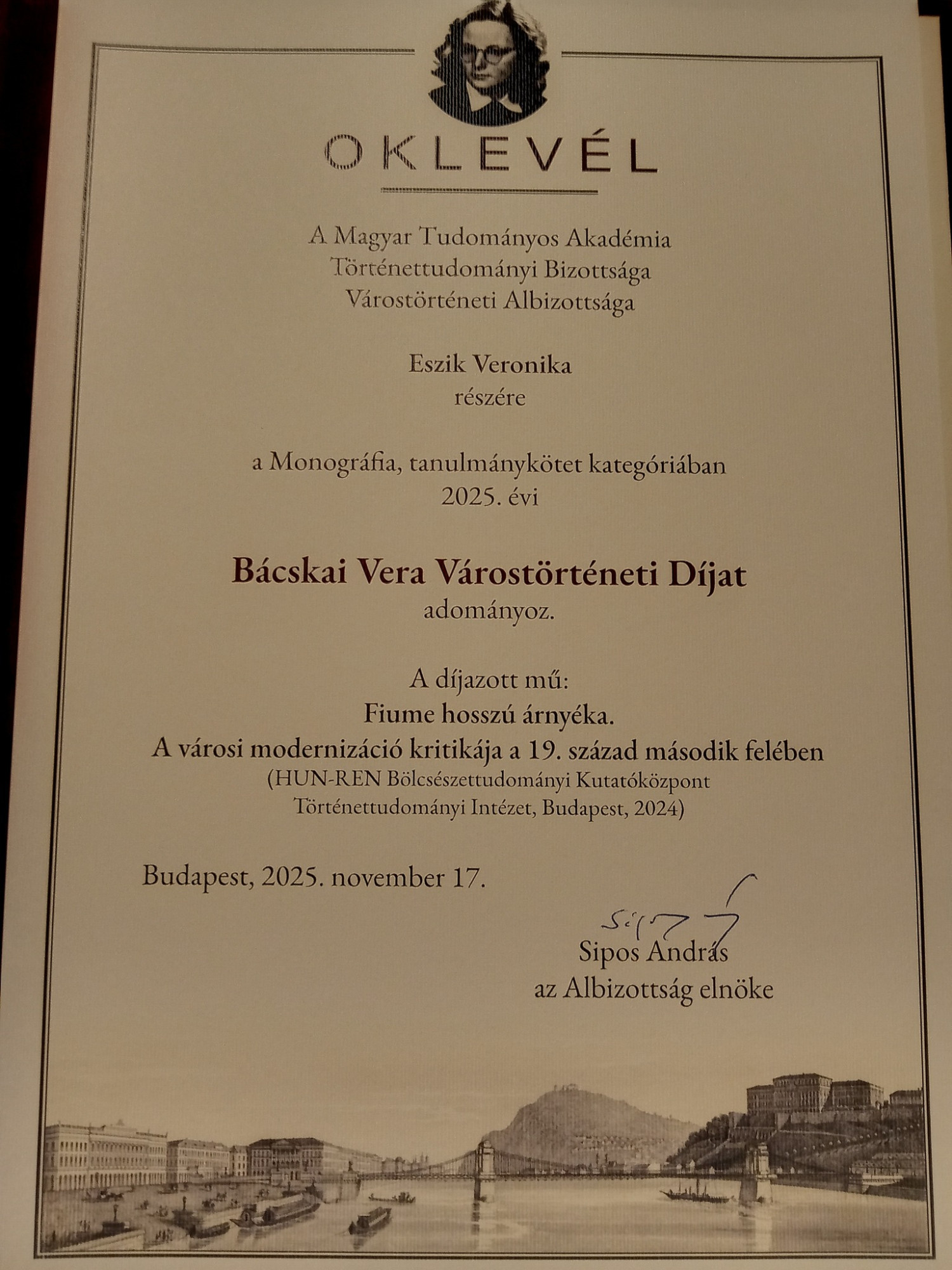Eszik Veronika, kutatóintézetünk tudományos munkatársa elnyerte az MTA Várostörténeti Albizottsága által alapított Bácskai Vera-díjat, amelyet a testület a 2024-ben megjelent Fiume hosszú árnyéka. A városi modernizáció kritikája a 19. század második felében című monográfia elismeréseként ítélt oda.