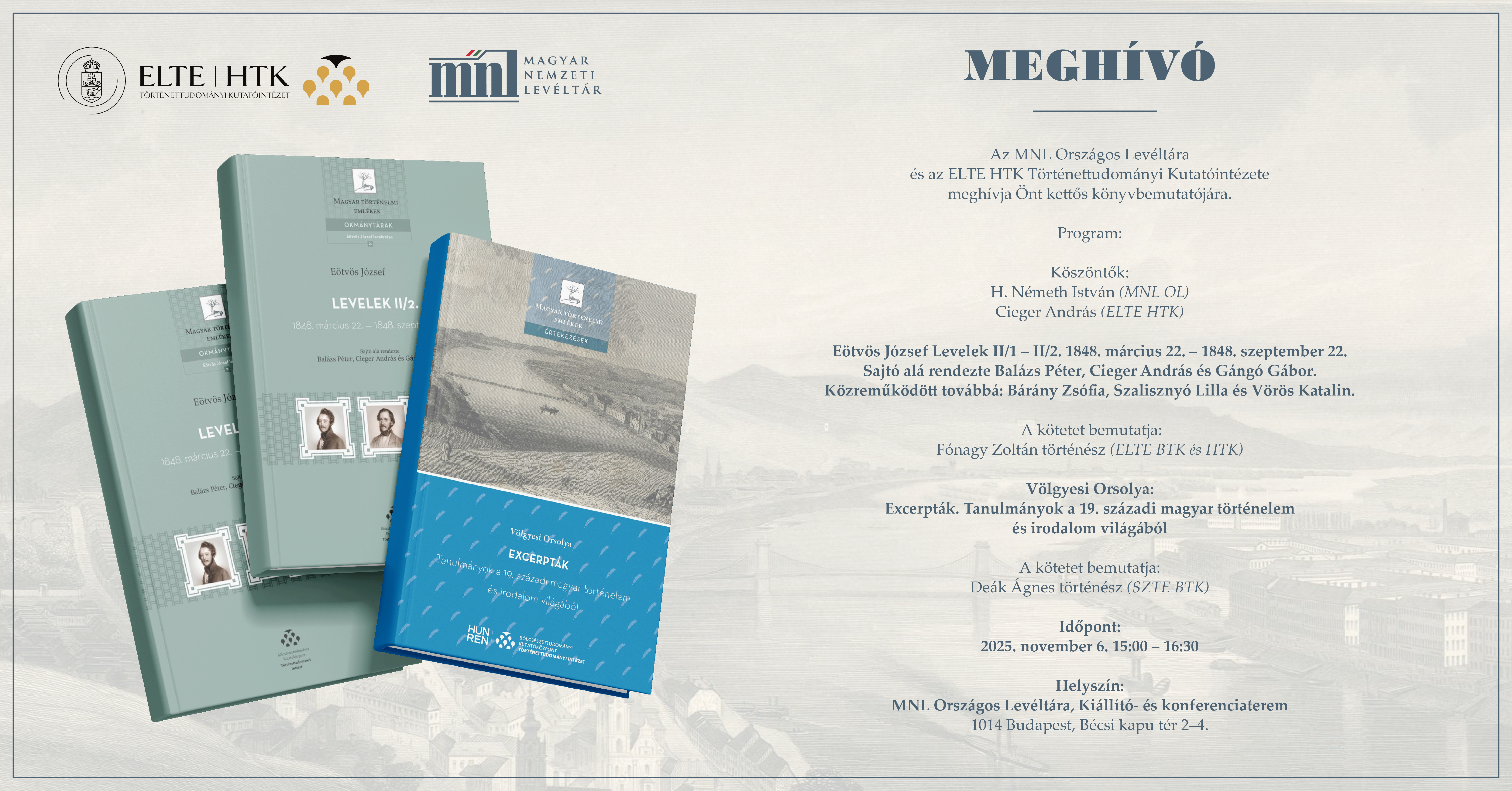 2025. november 6-án 15 órai kezdettel kettős könyvbemutatóra kerül sor az Országos Levéltár és az ELTE HTK Történettudományi Kutatóintézete közös rendezésében, a levéltár kiállító- és konferenciatermében. Eötvös József levelezésének második kötetét Fónagy Zoltán (ELTE BTK, ELTE HTK), Völgyesi Orsolya tanulmánykötetét pedig Deák Ágnes (Szegedi Tudományegyetem) mutatja be a közönségnek.