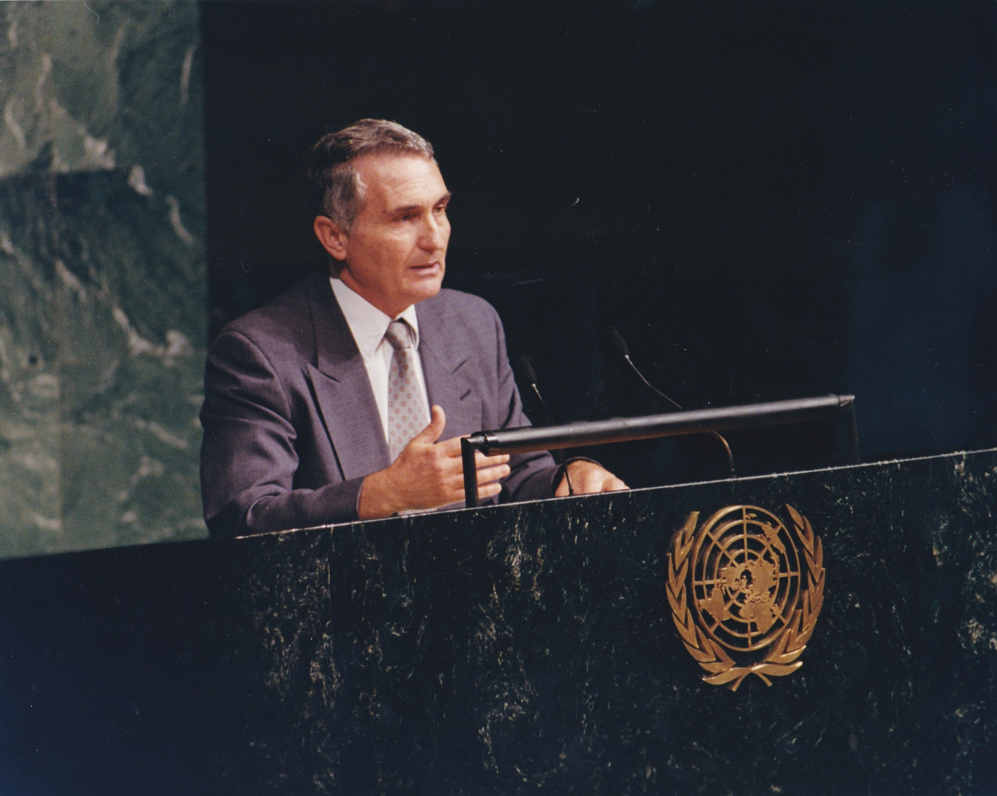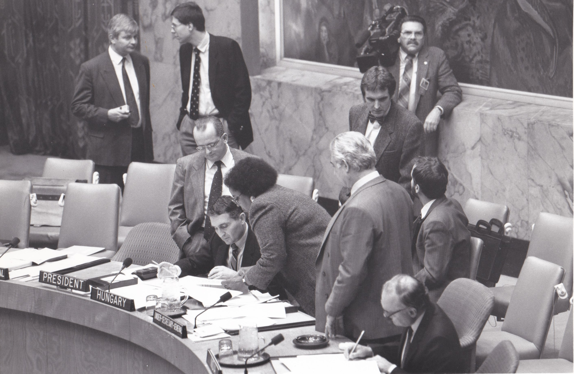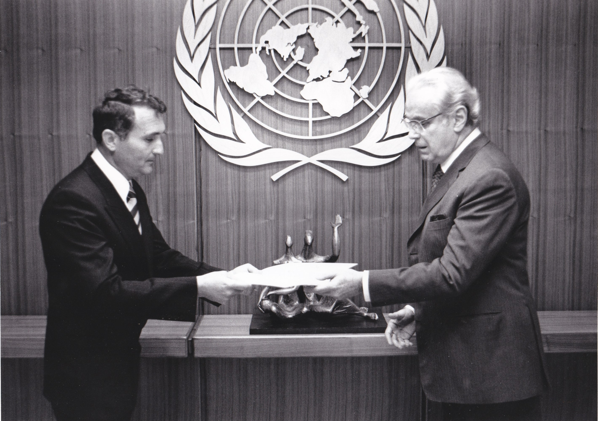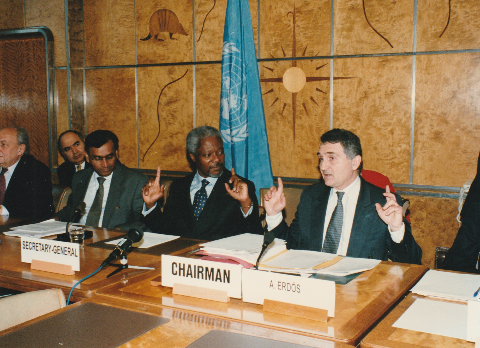Erdős André (1941) a 20. századi magyar külpolitika egyik legsikeresebb és legismertebb diplomatája. 1965-ben kezdődő szakmai pályafutásának legfontosabb színtere az Egyesült Nemzetek Szervezete volt. 1978 és 1983 között Magyarország állandó ENSZ-képviseletének tagja volt New Yorkban. 1982–1983-ban az ENSZ Közgyűlése 37. ülésszaka magyar elnökének különleges asszisztenseként dolgozott. 1989 és 1990 között a Külügyminisztérium Nemzetközi Szervezetek Osztályának vezetőjeként szolgált. 1990-ben kinevezték a New York-i magyar ENSZ-képviselet vezetőjévé. Amikor Magyarország 1992–1993-ban az ENSZ Biztonsági Tanácsának nem állandó tagja volt, ő képviselte hazánkat a testületben. Tagja volt annak a küldöttségnek, amely 1993-ban Bosznia-Hercegovinába látogatott. 1994-ben az ENSZ Leszerelési Bizottságának elnökévé választották.