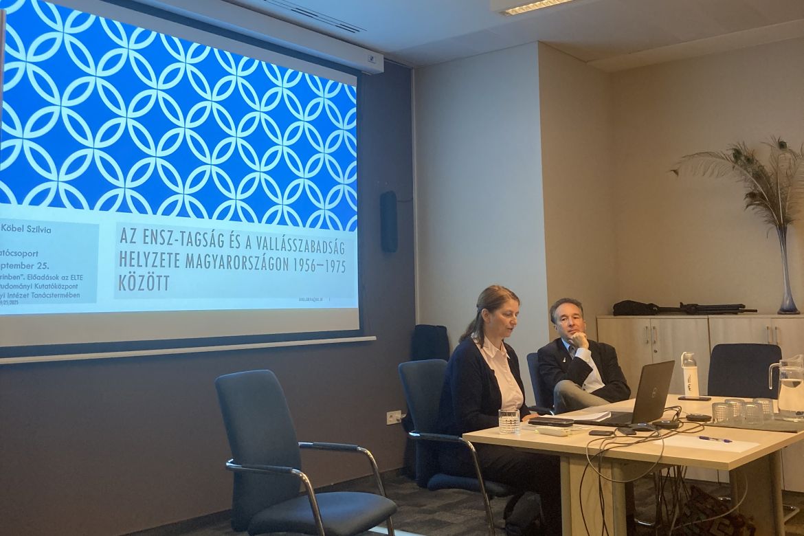 Köbel Szilvia habilitált egyetemi docens, rektori főtanácsadó, intézetvezető (Károli Gáspár Református Egyetem, Állam- és Jogtudományi Kar, Közjogi Intézet) Az ENSZ-tagság és a vallásszabadság helyzete Magyarországon 1956−1975 között című előadásának keretet adott az, hogy a pártállam 1956−1975 közötti időszakában egyszerre volt jelen az egyházpolitikában az 1956-os forradalom utáni megtorlás, majd pedig a konszolidálódás és az enyhülés.
